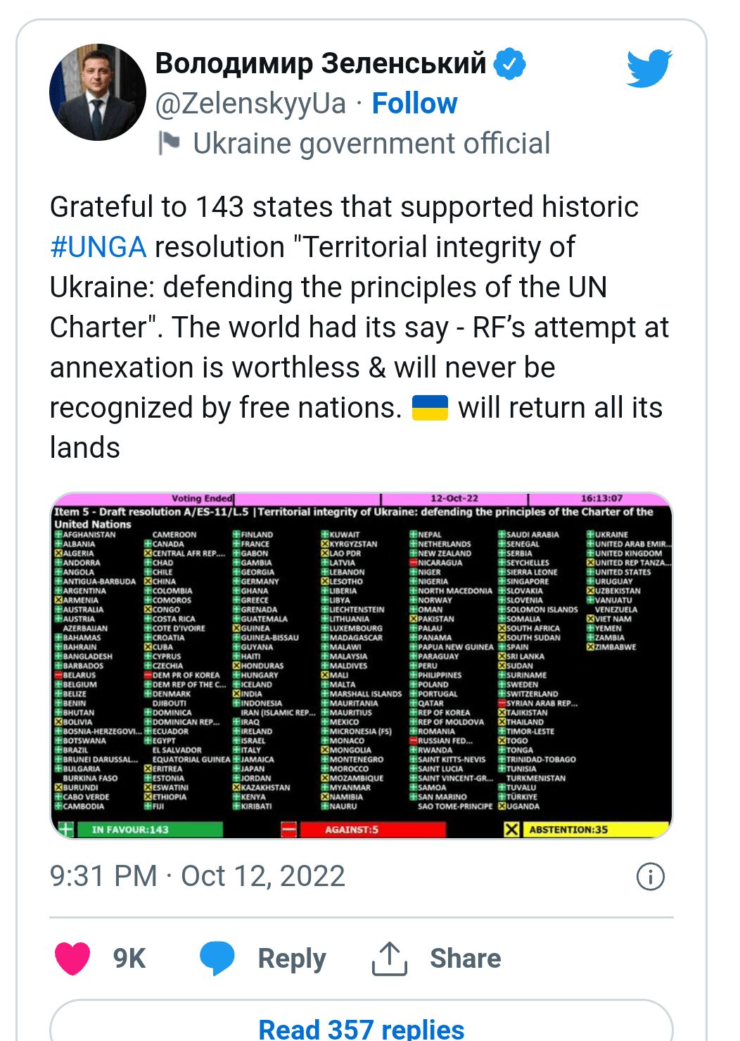 Lors de la session extraordinaire d’urgence de l’assemblée consacrée à l’Ukraine, 35 pays, dont la Chine, se sont abstenus de voter, tandis que 5 pays – le Nicaragua, la Corée du Nord, la Syrie, la Russie et le Belarus – ont voté contre la résolution. 143 pays ont voté en faveur de la motion, une victoire éclatante pour l’Ukraine, les États-Unis et leurs alliés.