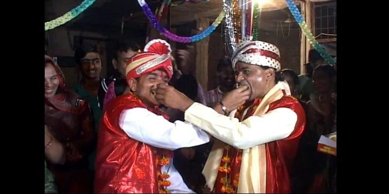 Sakaram Ahirwar, 35 ans, et Rakesh Ahirwar, 32 ans, ont échangé leurs vœux lors d’une cérémonie hindoue traditionnelle à laquelle plus de 300 personnes ont assisté. Leurs épouses respectives et enfants étaient également présents à la cérémonie qui a eu lieu à Indore, Madhya Pradesh.