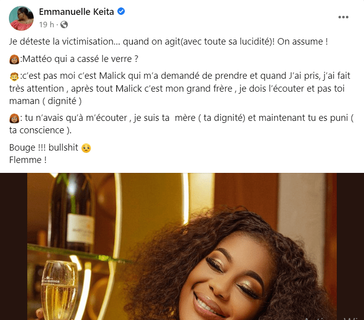 « Je déteste la victimisation… quand on agit (avec toute sa lucidité) ! On assume !« , a envoyé Emmanuelle Keita.