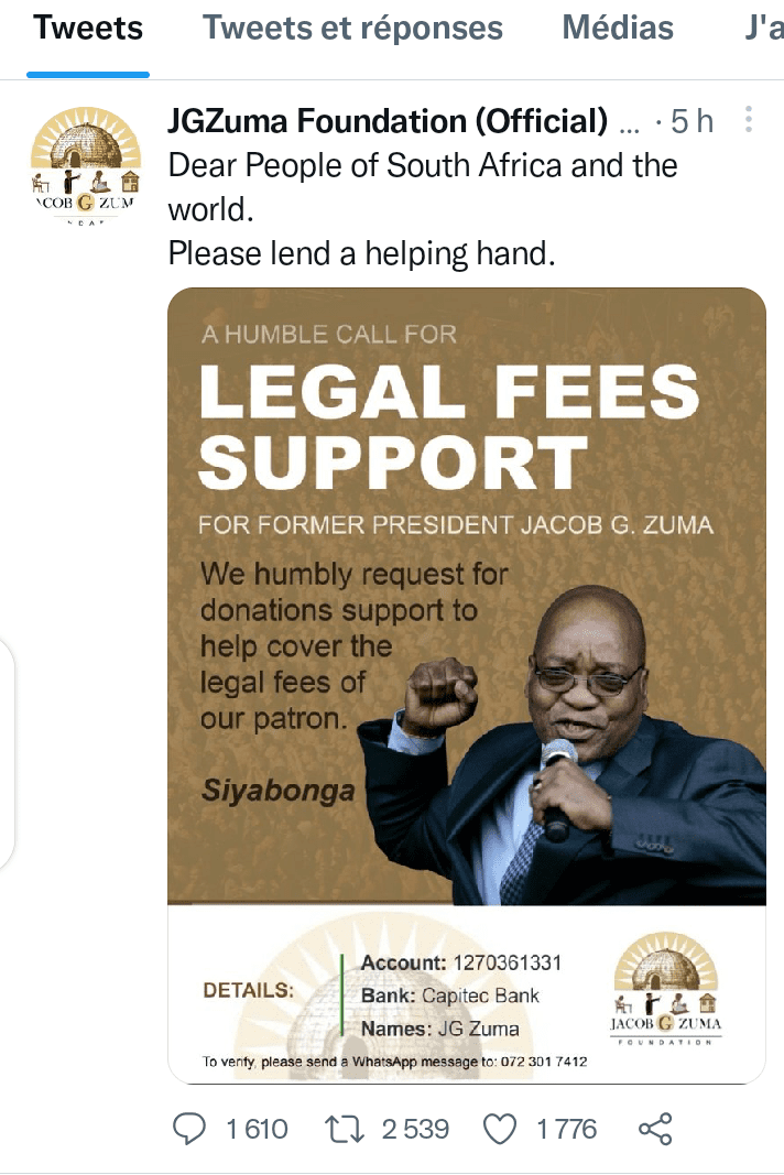 « Nous demandons humblement le soutien de dons pour aider à couvrir les frais de justice de notre chef« , a indiqué une affiche twittée par la fondation Jacob Zuma. L’affiche est aussi accompagnée de coordonnées bancaires et d’une photo de celui-ci.