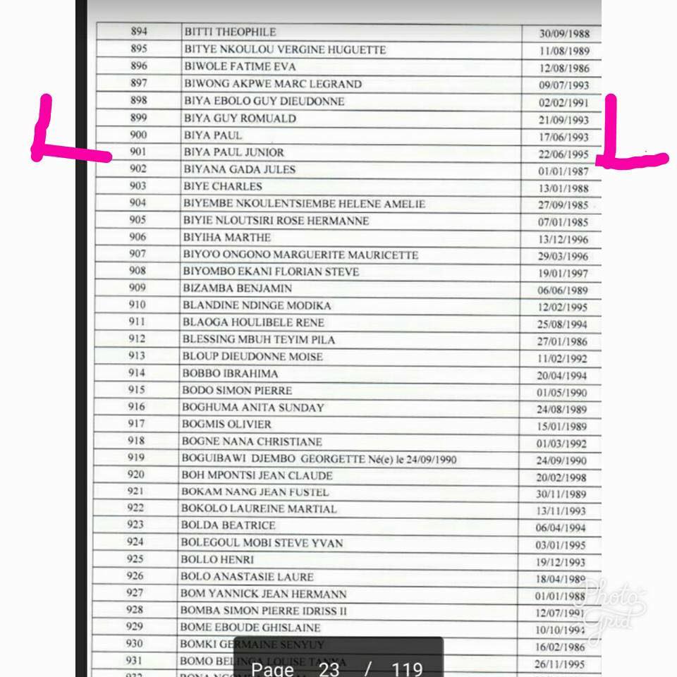 Alors que Biya Eyanga Elle Anasthasie Brenda est la candidate N°325 en Régies Financières, spécialité Trésor public, son frère Biya Paul Junior est candidat N°901 dans la filière de l’Administration Générale Cycle B.