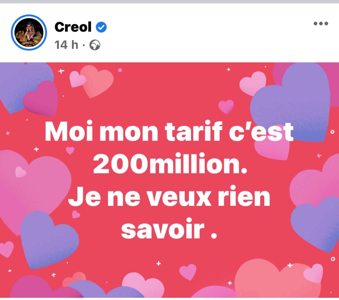 Creol déclare : "moi mon tarif, c'est 200 millions"