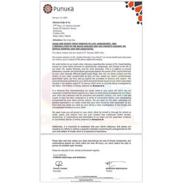 « Nous écrivons également dans notre courrier électronique ci-dessous concernant la conduite de M. David Adeleke envers notre cliente, qui équivaut à de la cyberintimidation, du harcèlement et des menaces de mort contre Mme Sophia Momodu et ses proches collaborateurs. Cela s’ajoute à plusieurs propos et publications diffamatoires parrainés contre Mme Sophia Momodu par votre client à travers différents blogs de réseaux sociaux », lit-on en partie dans le document.
