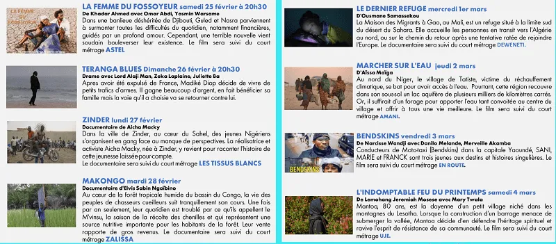 Tous les dimanches à 20 h 30, vous aurez un programme Cinéma Africain Spécial Mossa Sene Absa. Et puis enfin du 25 février au 04 mars, huit affiches d’une programmation spéciale FESPACO.