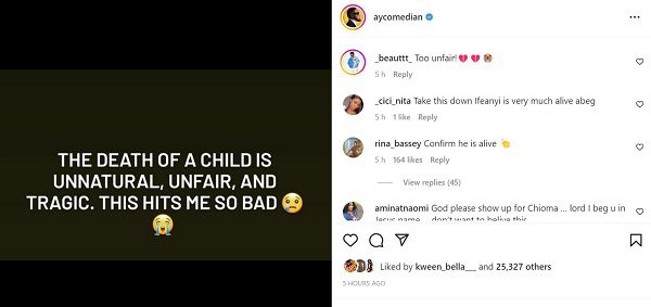 Réagissant à la triste nouvelle, le populaire comédien nigérian AY Makun a écrit : “La mort d’un enfant est contre nature, injuste et tragique, ça me touche tellement . »