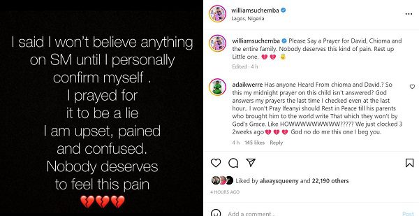 Il a écrit : “J’ai dit que je ne croirai rien sur RS (ndlr: réseaux sociaux) jusqu’à ce que je le confirme personnellement.  J’ai prié pour que ce soit un mensonge. Je suis bouleversé, peiné et confus. Personne ne mérite de ressentir cette douleur. Veuillez dire une prière pour David, Chioma et toute la famille. Personne ne mérite ce genre de douleur. Repose-toi Petit.”