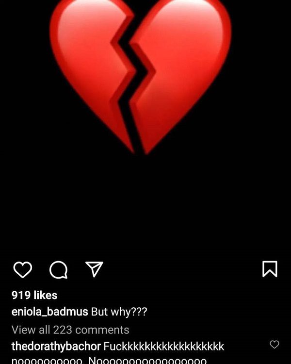 L’actrice Eniola Badmus proche amie de Davido a partagé une publication Instagram d’un emoji de cœur brisé sur fond noir, avec la légende « Mais pourquoi ». Elle a ensuite supprimé le message.