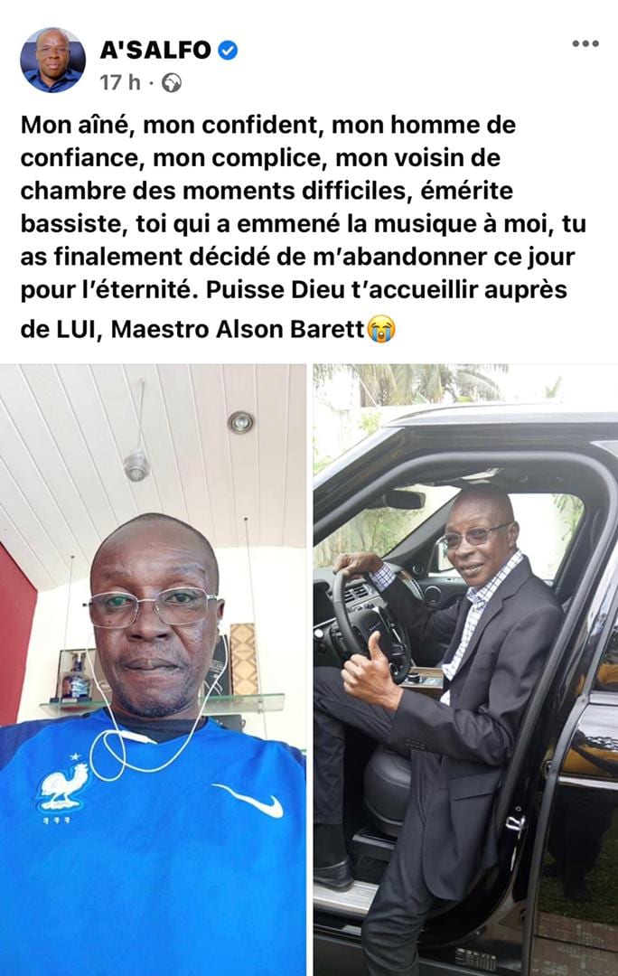 « Mon aîné, mon confident, mon homme de confiance, mon complice, mon voisin de chambre des moments difficiles, émérite bassiste. Toi qui as amené la musique à moi, tu as finalement décidé de m’abandonner ce jour pour l’éternité. Puisse Dieu t’accueillir auprès de lui, Maestro Alson Barett » ainsi s’est exprimé le Magicien.