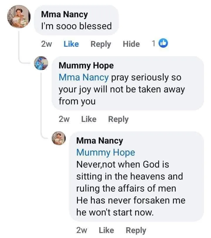 Selon une internaute, Hrm Isabella Udoiba, la défunte avait commenté sur une publication Facebook en écrivant “Je suis tellement bénie”. Une certaine Mummy Hope, considérée comme une prophétesse, a laissé un commentaire sous le commentaire de Mma, écrivant « Priez sérieusement pour que votre joie ne vous soit pas enlevée ». Mma a répondu en écrivant : « Jamais, pas quand Dieu est assis dans les cieux et dirige les affaires des hommes. Il ne m’a jamais abandonnée. »