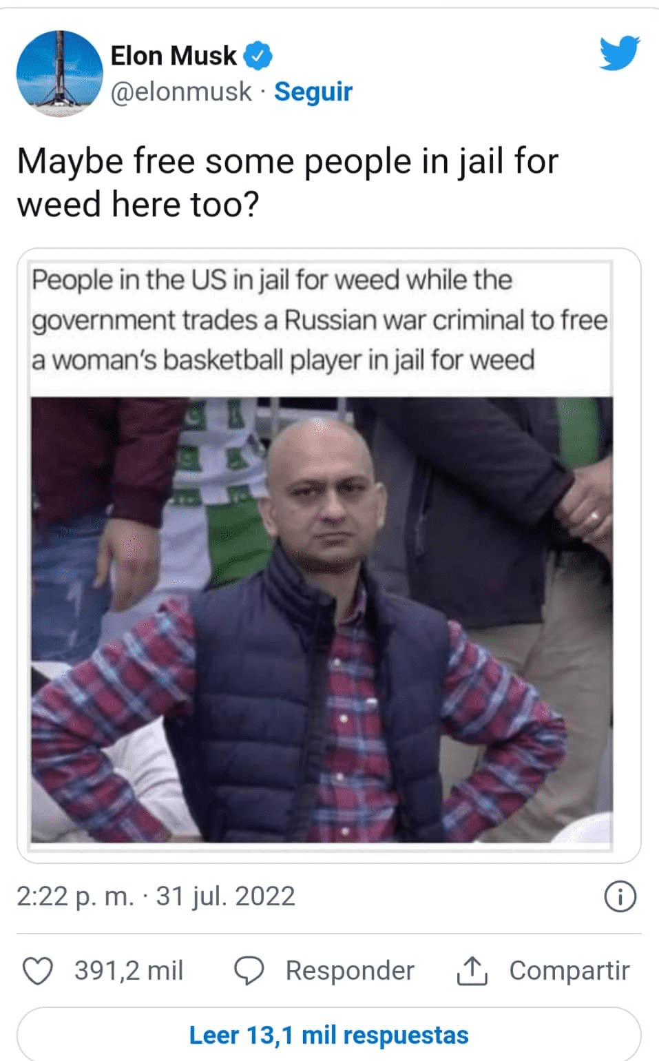 Musk a critiqué le fait que si le gouvernement américain envisageait de libérer Brittney Griner, il devrait également aider ceux qui purgent actuellement une peine pour possession de cannabis.