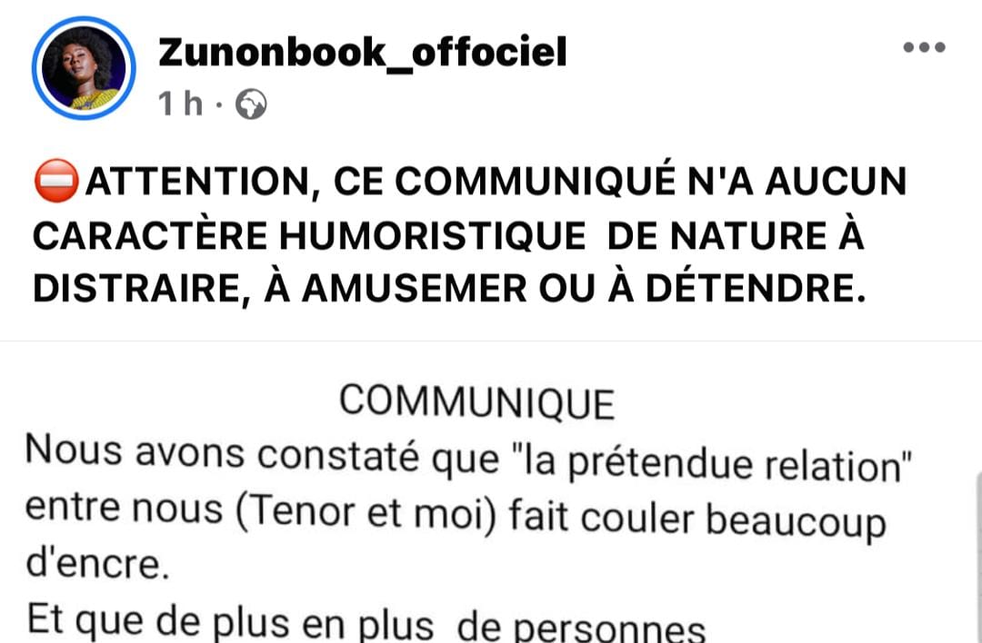 Eunice Zunon sort un communiqué qui »n’a aucun caractère humoristique » sur sa relation avec Tenor