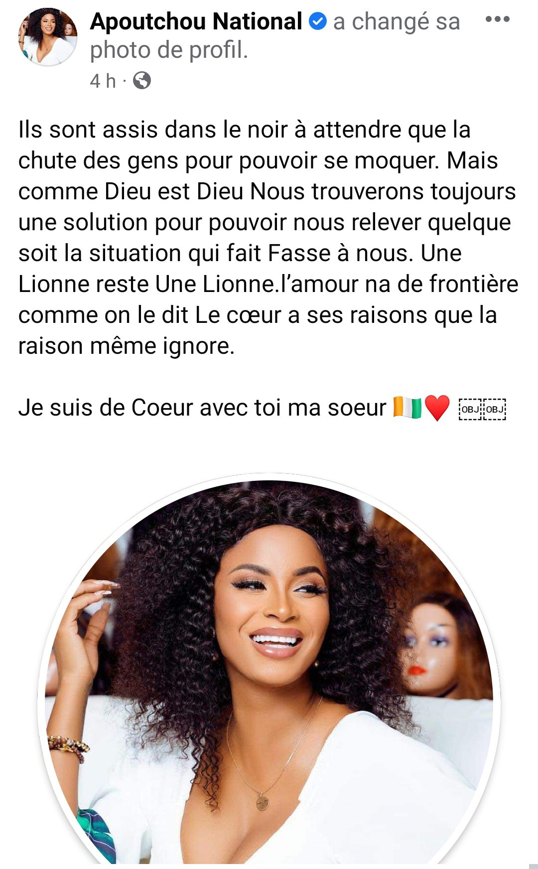 « Ils sont assis dans le noir à attendre que la chute des gens pour pouvoir se moquer. Mais comme Dieu est Dieu, nous trouverons toujours une solution pour pouvoir nous relever quel que soit la situation qui fait face à nous. Une Lionne reste Une Lionne. L’amour n’a pas de frontière comme on le dit. Le cœur a ses raisons que la raison même ignore. Je suis de Cœur avec toi ma sœur », a-t-il posté sur son compte Facebook.