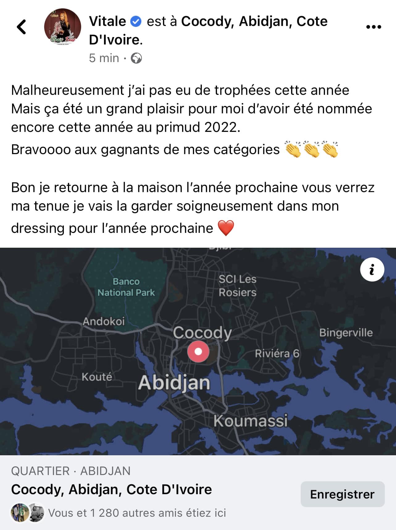 « Malheureusement, je n’ai pas eu de trophées cette année. Mais ça a été un grand plaisir pour moi d’avoir été nommée encore cette année au Primud 2022. Bravoooo aux gagnants de mes catégories. Bon je retourne à la maison l’année prochaine, vous verrez ma tenue, je vais la garder soigneusement dans mon dressing pour l’année prochaine » a partagé la chanteuse.