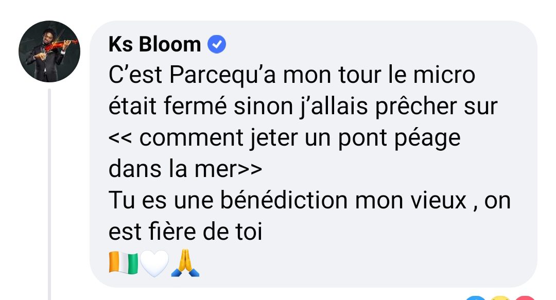 Sous ce post, KS Bloom a apporté son soutien à l’artiste avant de dire qu’il aurait dénoncer la mise en place du pont à péage de Grand Bassam s’il avait eu l’opportunité.