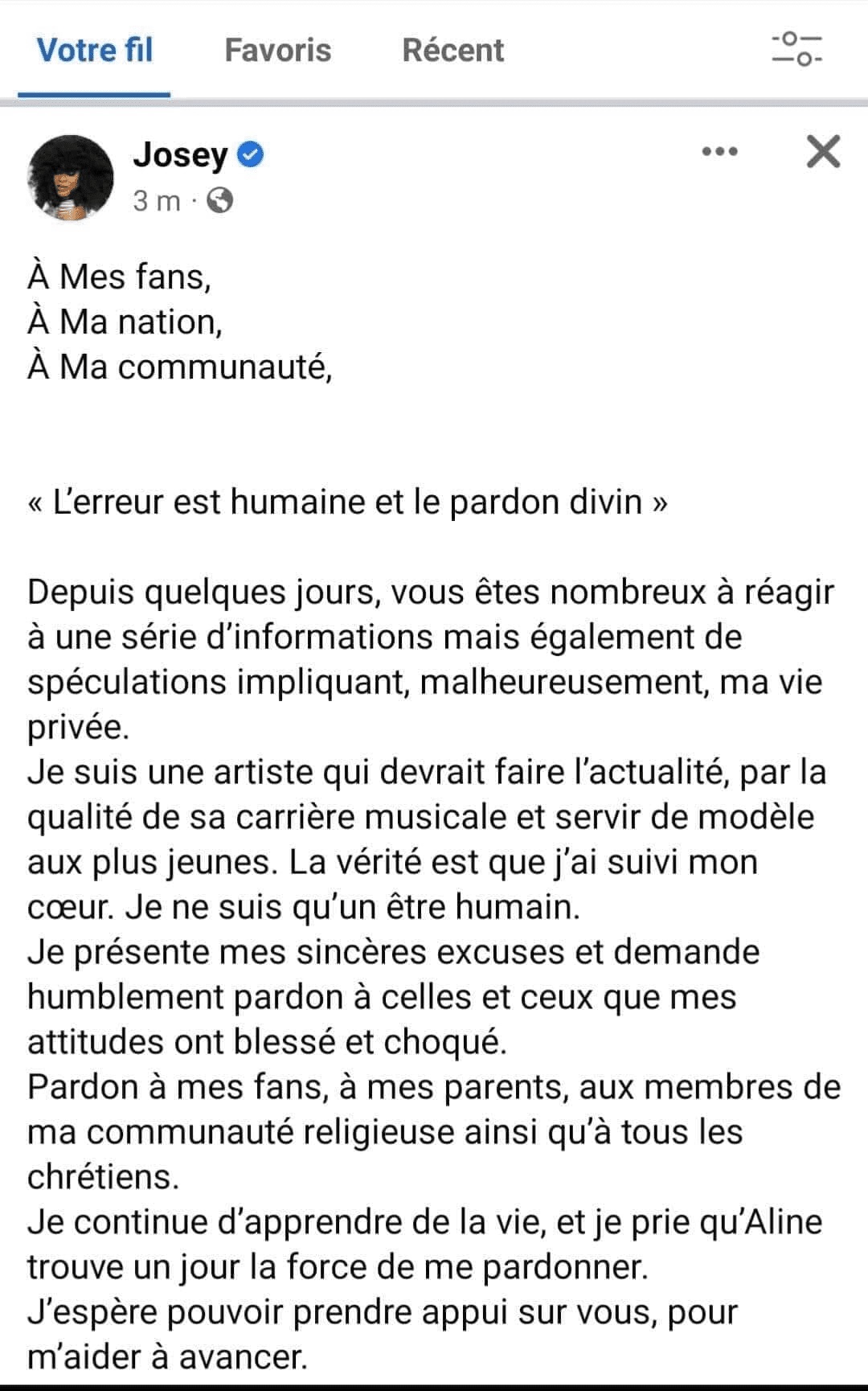 « Depuis quelques jours, vous êtes nombreux à réagir à une série d’informations, mais également de spéculations impliquant, malheureusement, ma vie privée. Je suis une artiste qui devrait faire l’actualité, par la qualité de sa carrière musicale et servir de modèle aux plus jeunes. La vérité est que j’ai suivi mon cœur. Je ne suis qu’un être humain. Je présente mes sincères excuses et demande humblement pardon à celles et ceux que mes attitudes ont blessés et choqués. Pardon à mes fans, à mes parents, aux membres de ma communauté religieuse ainsi qu’à tous les chrétiens » a regrettablement envoyé Josey.