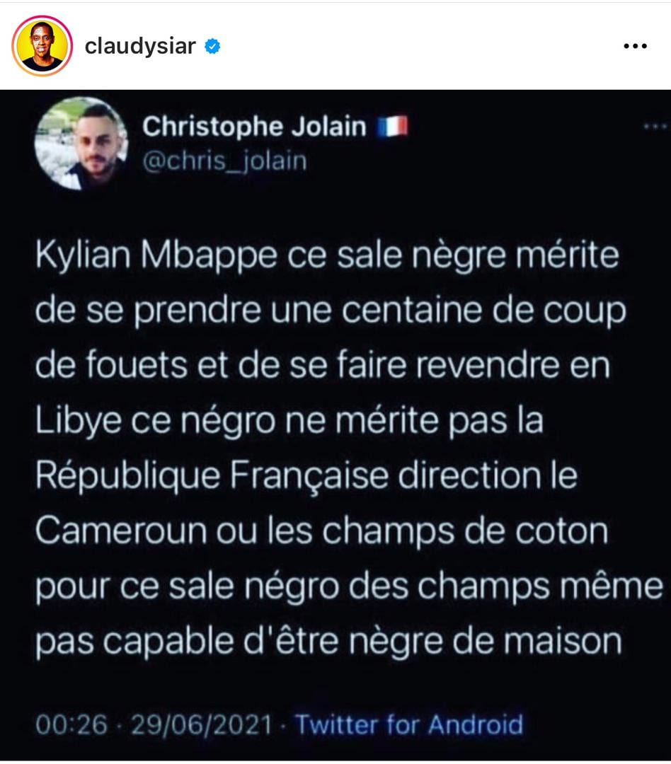 Une pilule très mal digérée par les supporters français. Certains n’ont pas manqué d’exprimer leur mécontentement. Publication, cris de colère, les choses sont allées en grande majorité dans le mauvais sens sur la toile juste après la défaite de la France. Un internaute très remonté, a quant à lui, déversé son venin sur celui qu’on qualifie de »coupable » de la fameuse défaite, Kyliane M’bappé. Dans un tweet, un nommé Christophe Jolain, a carrément injurié l’attaquant, le traitant de sale nègre.