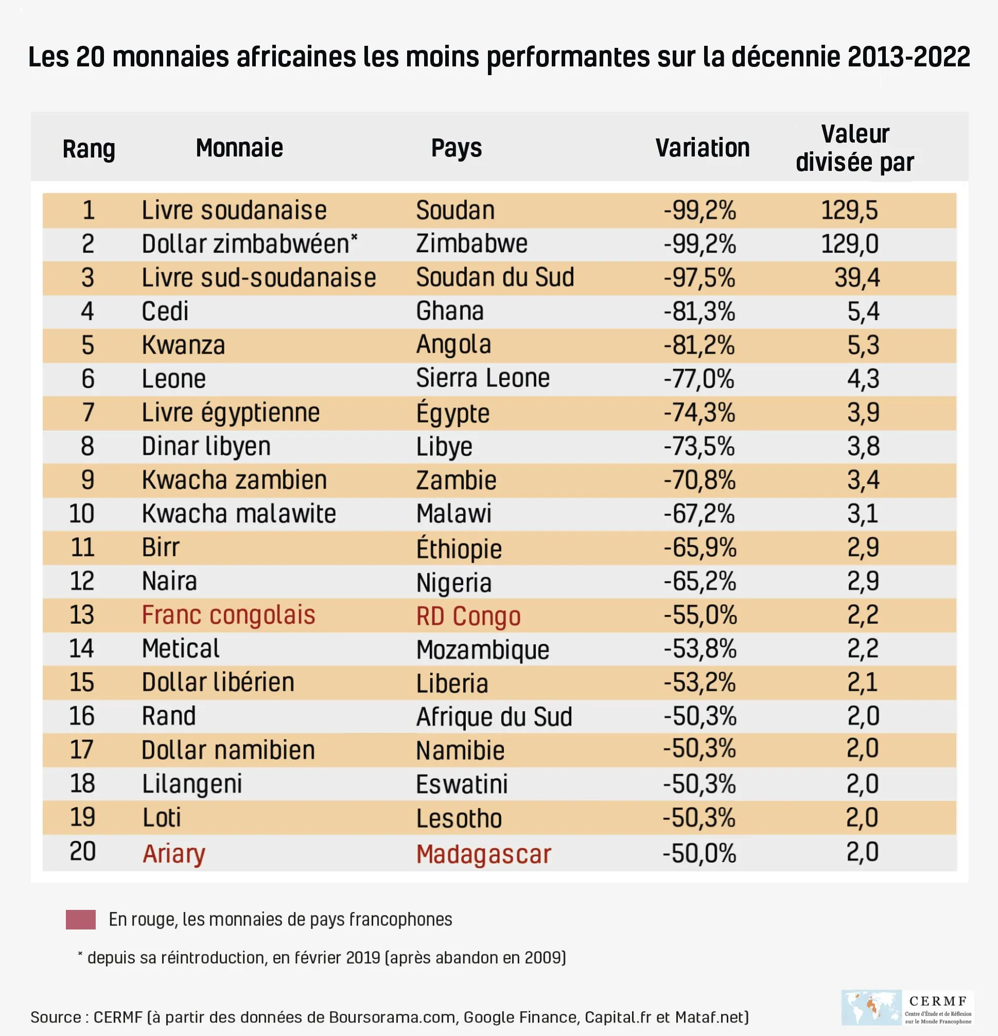 Sur les 41 monnaies africaines, vingt ont vu leur valeur divisée au moins par deux sur la période de dix années allant de début 2013 à fin 2022 (suivies par le dinar tunisien, qui frôle la barre des 50 %, avec une baisse de 49,9 %). Parmi ces vingt monnaies, dix ont vu leur valeur divisée au moins par trois (talonnées par le birr éthiopien et le naira du Nigeria, dont le cours a été divisé par 2,9).