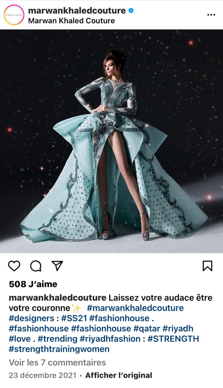 Notre petite investigation constate que la robe n’est effectivement pas l’œuvre d’un styliste ivoirien, mais plutôt libanais. Pour avoir une telle distinction, la robe n’a pas été conçue par un seul, mais plutôt deux designers nommés Marwan et Khaled. Il s’agit en effet d’une haute couture réalisée pour la première fois par les stylistes Marwan et Khaled en 2021.