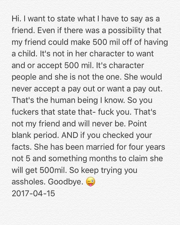 Gil Duldulao l’un des amis de la chanteuse a défendu la chanteuse via un post sur instagram (ci-dessous). Il a mis en mal la folle rumeur qui laisse entendre que Janet Jackson avait divorcé pour se faire de l’argent. « Je veux dire ce que j’ai à dire en tant qu’ami. Même s’il y avait la possibilité que mon amie empoche 500 millions [grâce à son enfant]. Ce n’est pas dans sa personnalité de vouloir ou d’accepter 500 millions […]. Elle n’accepterait jamais d’être payée comme ça. C’est l’être humain génial que je connais. Ceux qui racontent des c*nneris allez-vous faire f*utre. Mon amie n’est pas comme ça et elle ne le sera jamais. Un point c’est tout », a-t-il écrit.