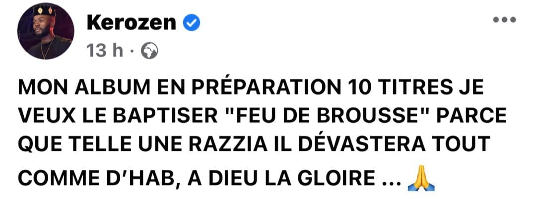 Le chanteur compte offrir à ses fans une œuvre de qualité. Kerozen a porté à l’attention de ses fans qu’il livrerait très bientôt un album de 10 titres. En ce qui concerne les sonorités, le chanteur annonce de redoutables « tueries musicales ».