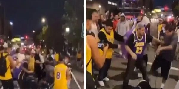 Plusieurs fans des Lakers l’ont frappé alors qu’il se trouvait à même le sol, l’un d’entre eux a même utilisé une trottinette électrique comme arme ! Attention, la vidéo de l’incident peut heurter les sensibilités :