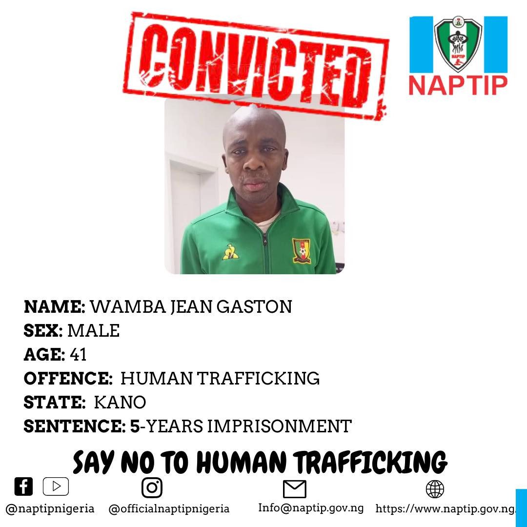Une Haute Cour fédérale de Kano au Nigeria a condamné un Camerounais de 41 ans, Wamba Jean-Gaston, à cinq ans de prison pour le trafic de trois jeunes femmes et quatre hommes qu’il a pris au Cameroun pour le Nigeria, ensuite les faire partir vers l’Europe.