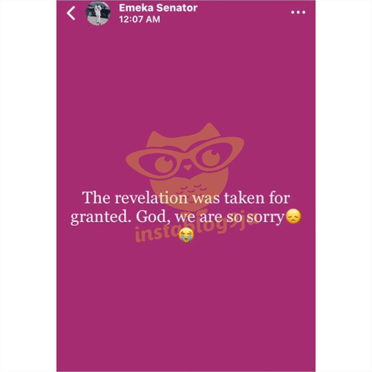 Emeka Senator a révélé dans une publication sur sa Instagram story qu’ils avaient pris ce qui semblait être un avertissement de Dieu à la légère.