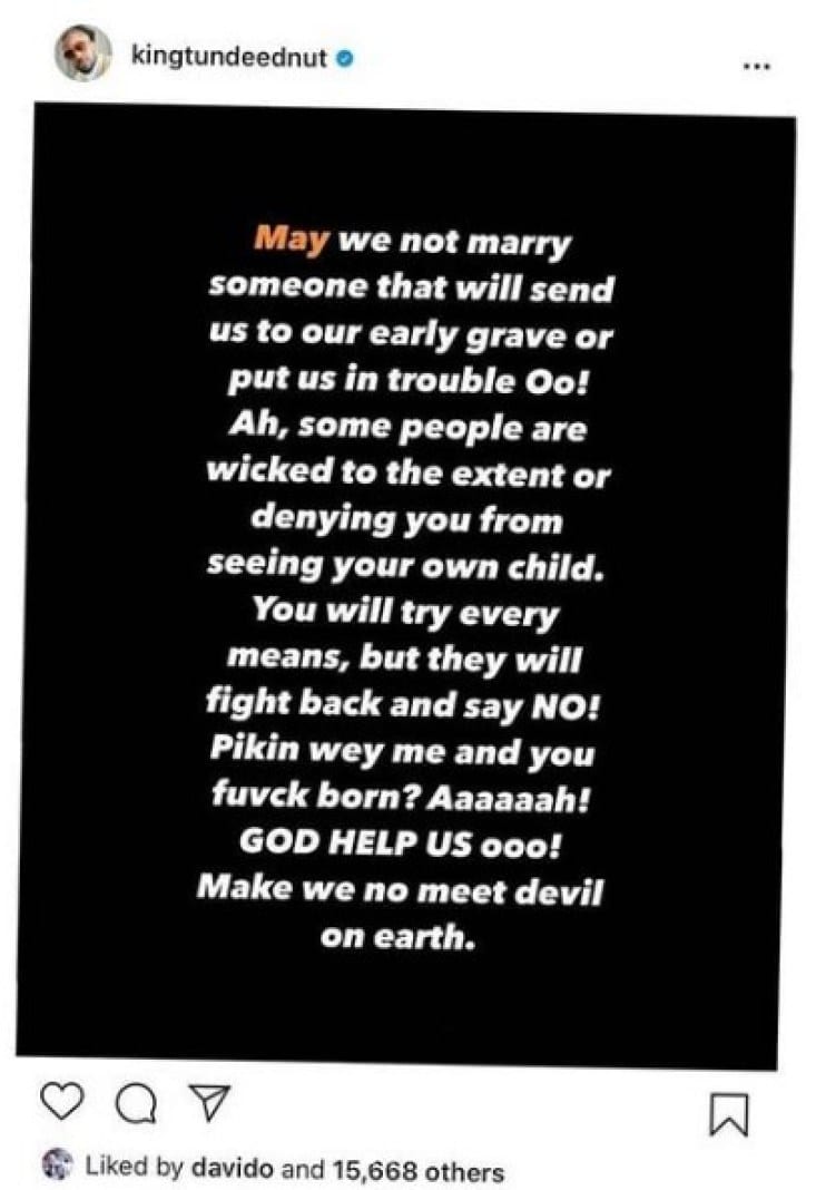 Selon Cutie, Chioma a quitté la maison de Davido et refuse que ce dernier voit son fils Ifeanyi depuis le mois de septembre de l’année dernière. Tunde s’est maintenant tourné vers les médias sociaux pour laisser entendre que Davido a toujours du mal à voir son fils.