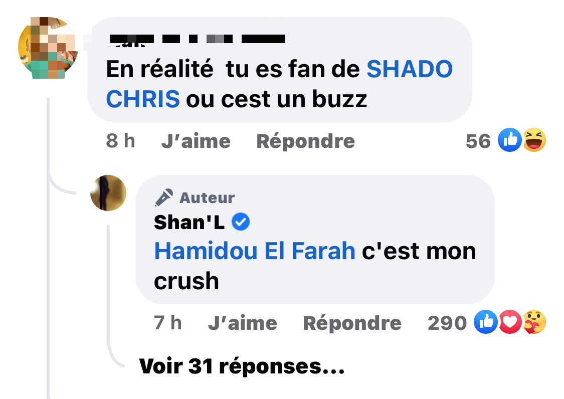 Dans la soirée du mercredi, Shan’l a offert une lucarne à ses fans. Dans un jeu de questions-réponses, Shan’l s’est livrée à cœur ouvert à ses fans. A la question de savoir si elle entretenait effectivement une relation amoureuse avec Shado Chris, elle a répondu simplement qu’il était son « crush » en d’autres termes, elle serait attirée par lui.