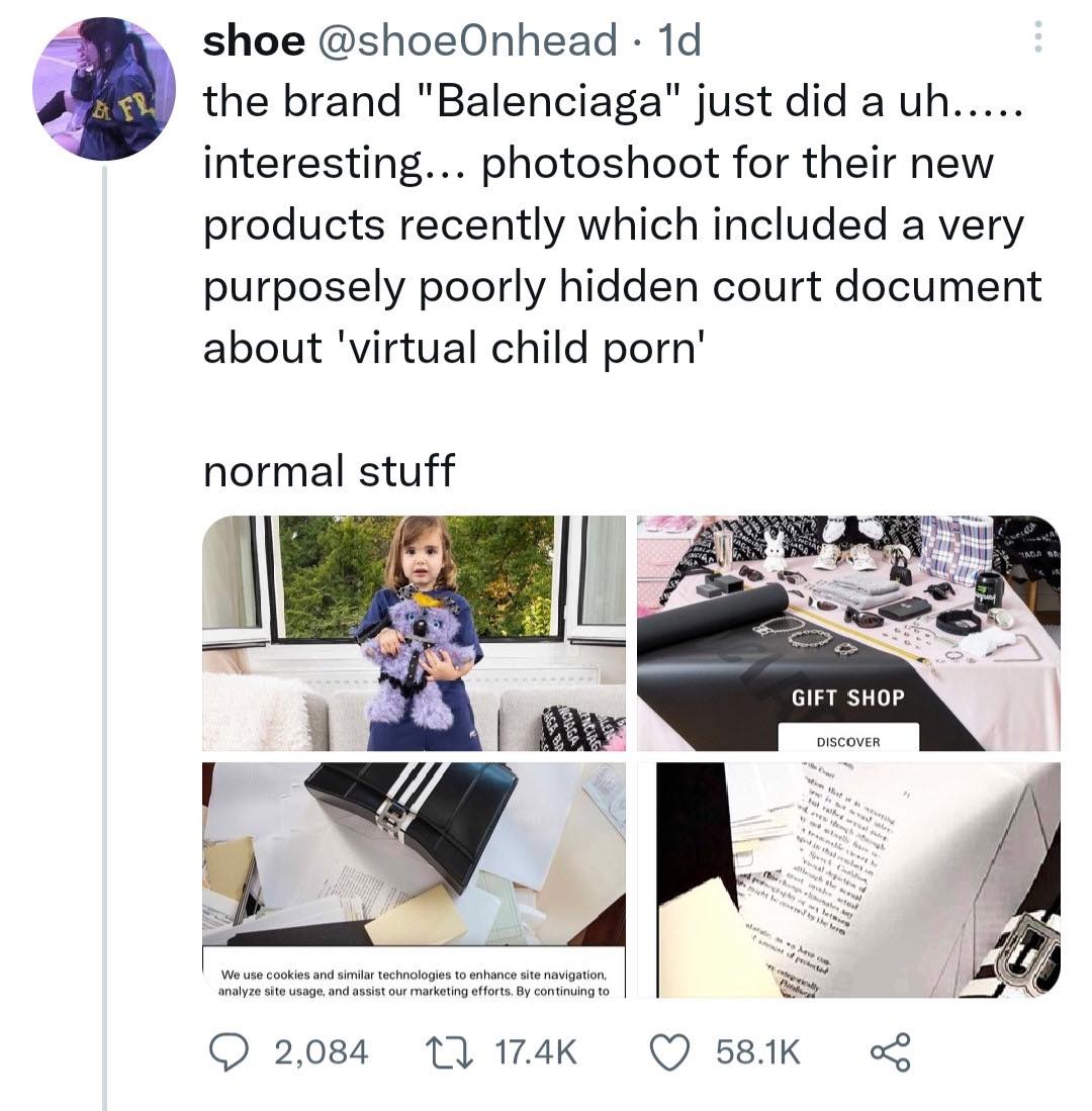La deuxième publicité examinée est la campagne printemps 2023 de Balenciaga, qui comportait une impression d’une décision de la Cour suprême sur la pédopornographie et un livre sur l’artiste belge Michaël Borremans, dont les travaux antérieurs comprenaient des représentations d’enfants castrés.