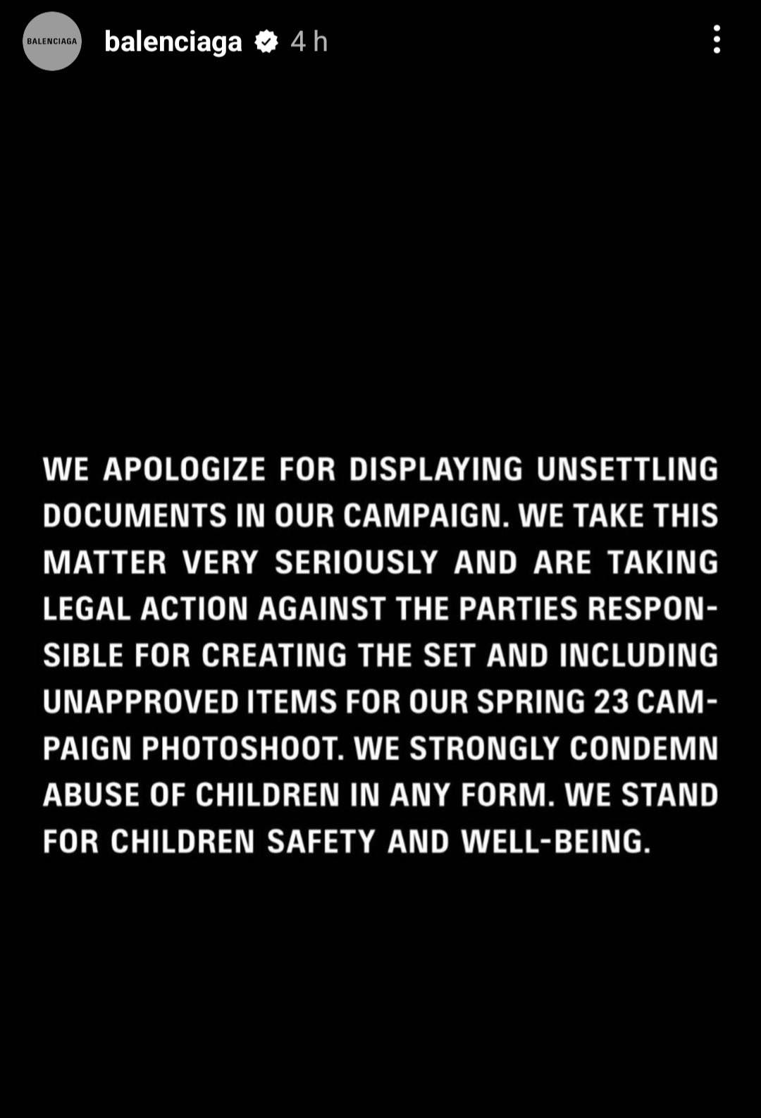 NOUS AVONS IMMÉDIATEMENT SUPPRIMÉ LA CAMPAGNE DE TOUTES LES PLATEFORMES. NOUS NOUS EXCUSONS D’AFFICHER DES DOCUMENTS TROUBLES DANS NOTRE CAMPAGNE. NOUS PRENONS CETTE QUESTION TRÈS AU SÉRIEUX ET ENGAGEONS DES ACTIONS EN JUSTICE CONTRE LES PARTIES RESPONSABLES DE LA CRÉATION DE L’ENSEMBLE ET D’INCLURE DES ÉLÉMENTS NON APPROUVÉS POUR NOTRE SÉANCE PHOTO DE LA CAMPAGNE PRINTEMPS 23. NOUS CONDAMONS FERMEMENT LA MALTRAITANCE DES ENFANTS SOUS TOUTE FORME. NOUS REPRÉSENTONS LA SÉCURITÉ ET LE BIEN-ÊTRE DES ENFANTS.”, a écrit Balenciaga sur sa page Instagram.