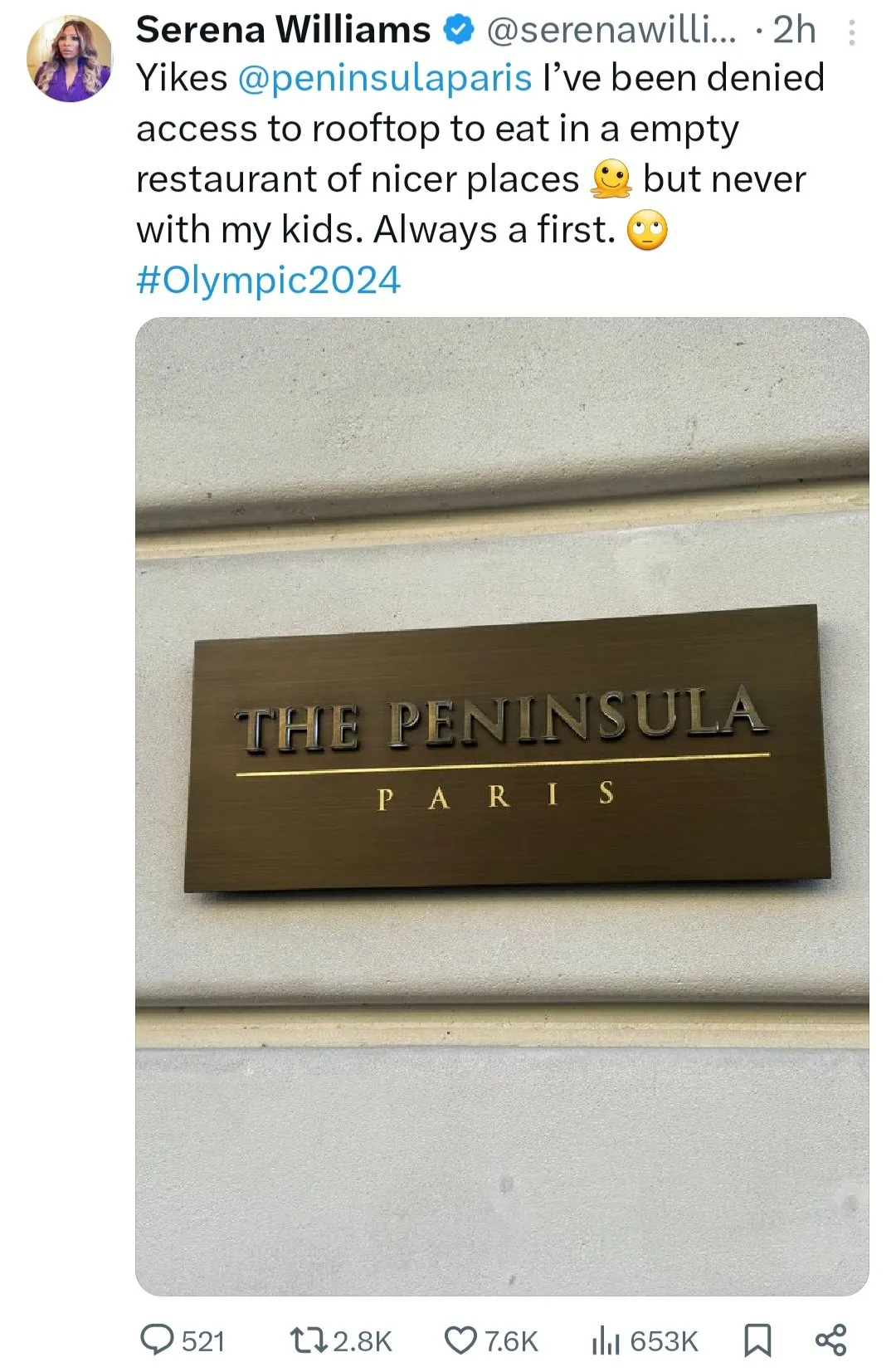 Williams a exprimé sa frustration sur la plateforme de médias sociaux X, en déclarant : « Oups @peninsulaparis. On m’a refusé l’accès au rooftop pour manger dans des restaurants vides dans des endroits beaucoup plus sympas. Mais jamais avec mes enfants.»