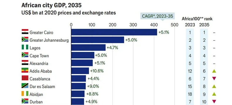 Les principaux centres urbains du continent, comme Le Caire, Lagos et Johannesburg, continueront de figurer parmi les 100 premières économies urbaines d’Afrique d’ici 2035. En 2023, le PIB nominal combiné de ces villes s’élevait à 1 400 milliards de dollars, et d’ici 2035, ce chiffre devrait plus que tripler, atteignant plus de 5 000 milliards de dollars.