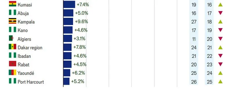 Selon l’ Economist Intelligence Unit , d’ici le milieu des années 2030, les 100 plus grandes villes d’Afrique abriteront près de 400 millions de personnes, soit environ 21 % de la population du continent. Ces villes généreront plus de 60 % du PIB de l’Afrique.