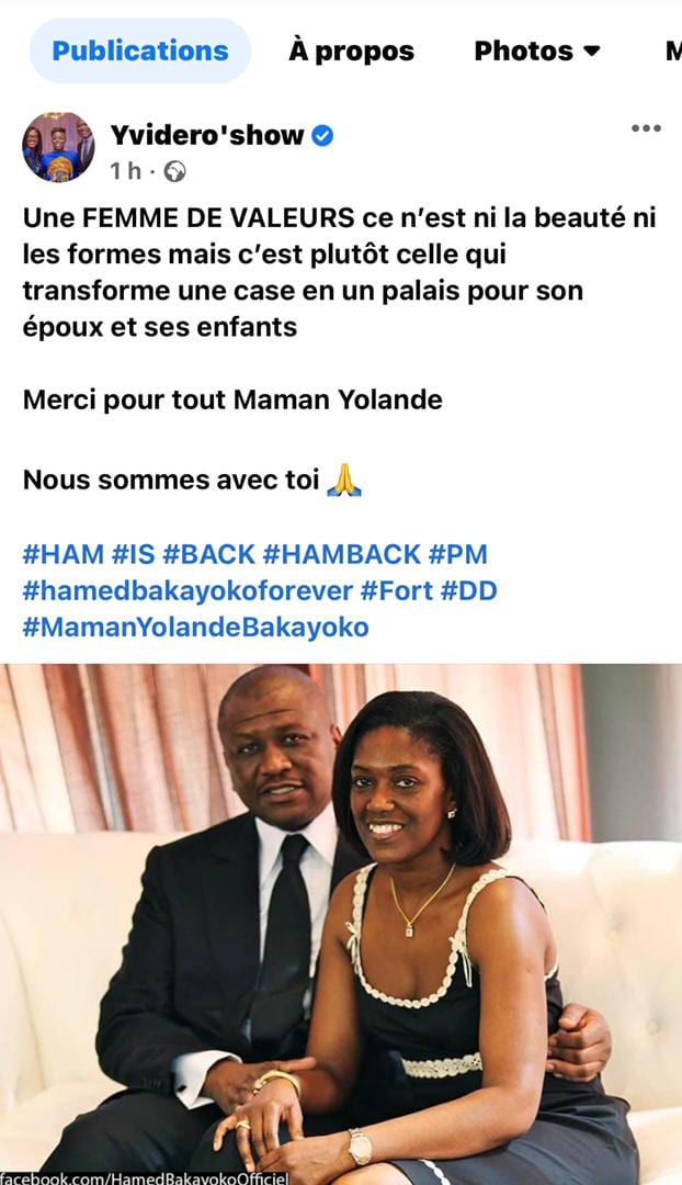 La série d’hommages n’est pas prête d’être terminer d’ici peu, tant le Premier Ministre Hamed Bakayoko s’est entiché d’affection durant son existence sur terre. Autant l’on lui rend hommage, autant, on apporte soutien et réconfort à sa famille et particulièrement à son épouse Yolande Bakayoko. Sur internet, plusieurs acteurs du showbiz, proches d’Hamed Bakayoko, ou encore des artistes ont laissé des messages de soutien à la veuve du Premier Ministre. Le message d’Yvidero a particulièrement fait incliner les cœurs sur internet.