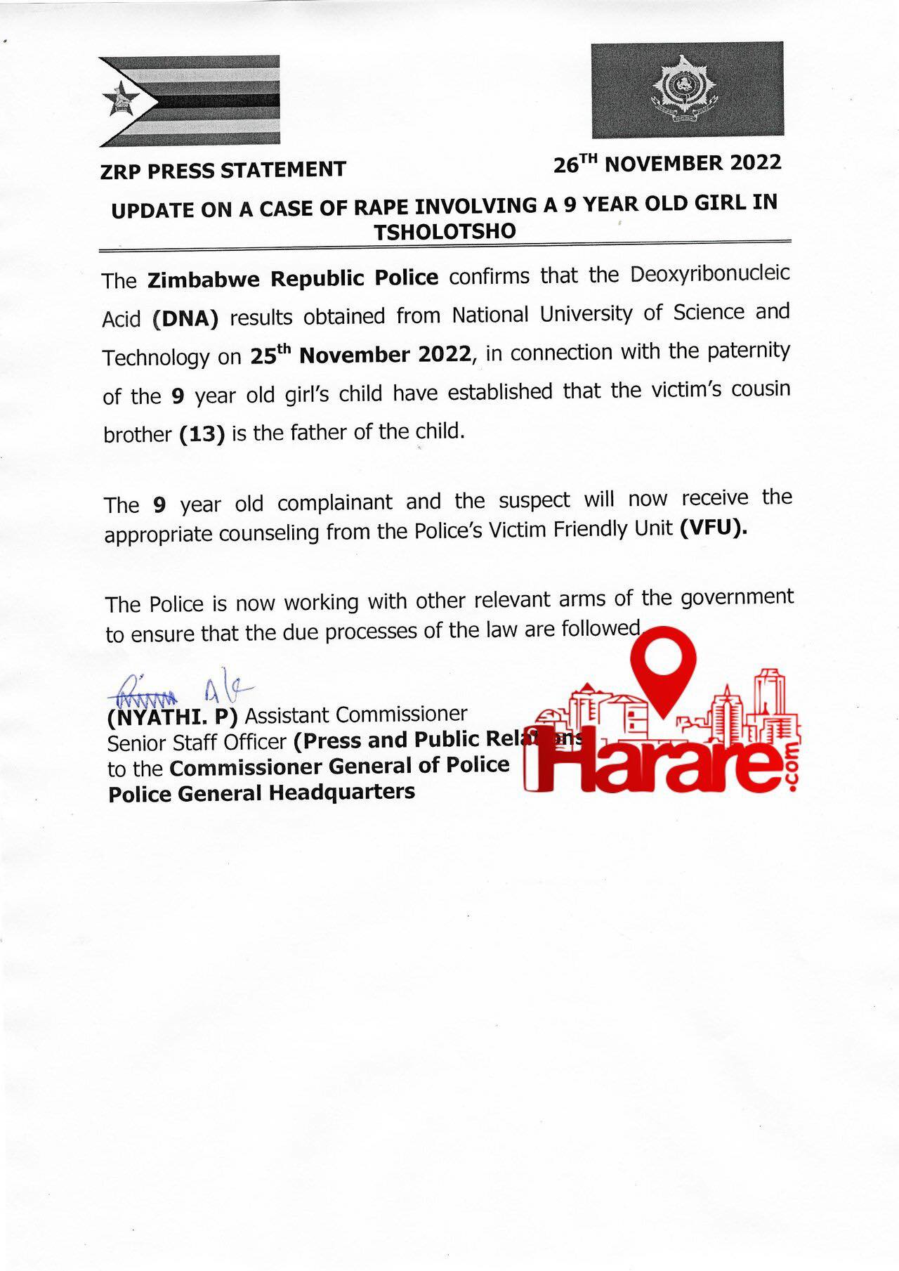 La police de la République du Zimbabwe confirme que les résultats de l’analyse de l’acide désoxyribonucléique (ADN) obtenus de l’Université nationale des sciences et technologies le 25 novembre 2022, en rapport avec la paternité de l’enfant de la fillette de 9 ans, ont établi que le frère cousin de la victime (13 ans) est le père de l’enfant. La plaignante de 9 ans et le suspect recevront désormais les conseils appropriés de la part de l’Unité d’aide aux victimes (VFU) de la police. La police travaille maintenant avec d’autres branches compétentes du gouvernement pour s’assurer que les procédures régulières de la loi sont respectées. »